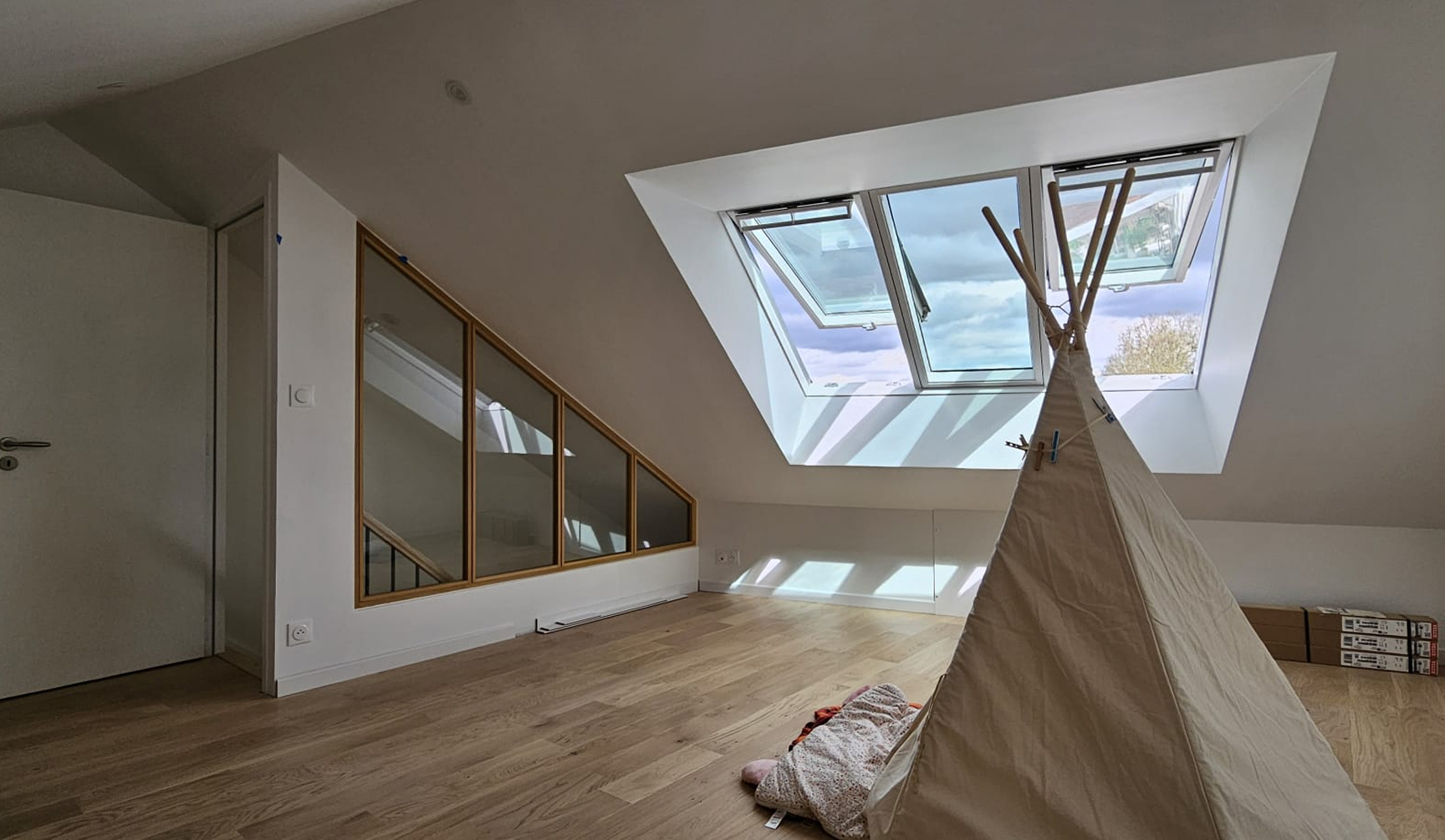 Experts en aménagement de combles depuis plus de 60 ans, nous mettons en œuvre notre savoir-faire pour donner vie à vos projets d’aménagement de combles. Qu’il s’agisse de créer une nouvelle chambre lumineuse, une suite parentale confortable, un bureau cosy, ou toute autre pièce dont vous rêvez, nous transformons l’espace inutilisé de votre maison. Ces travaux de rénovation et d’aménagement de combles représentent la solution idéale pour gagner de l’espace et considérablement augmenter votre surface habitable sans avoir à déménager. Notre expertise garantit un aménagement de combles qui valorise durablement votre patrimoine.